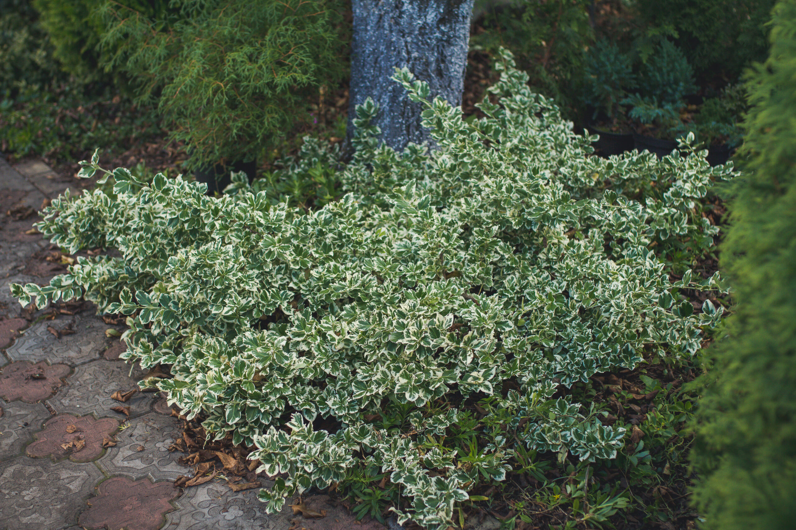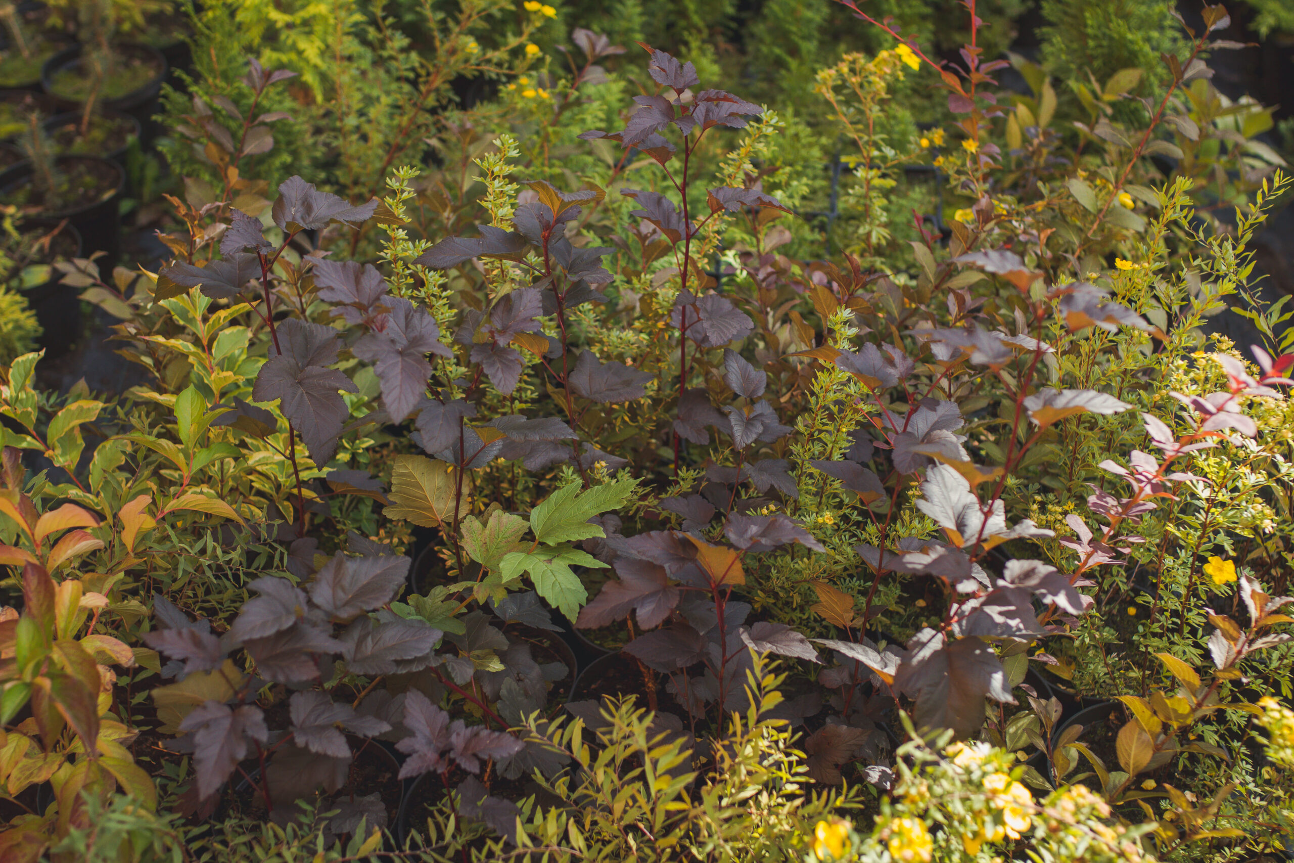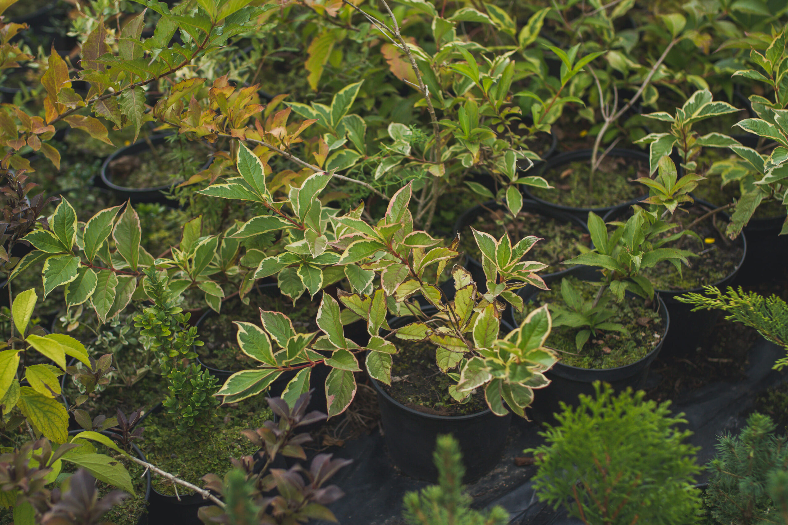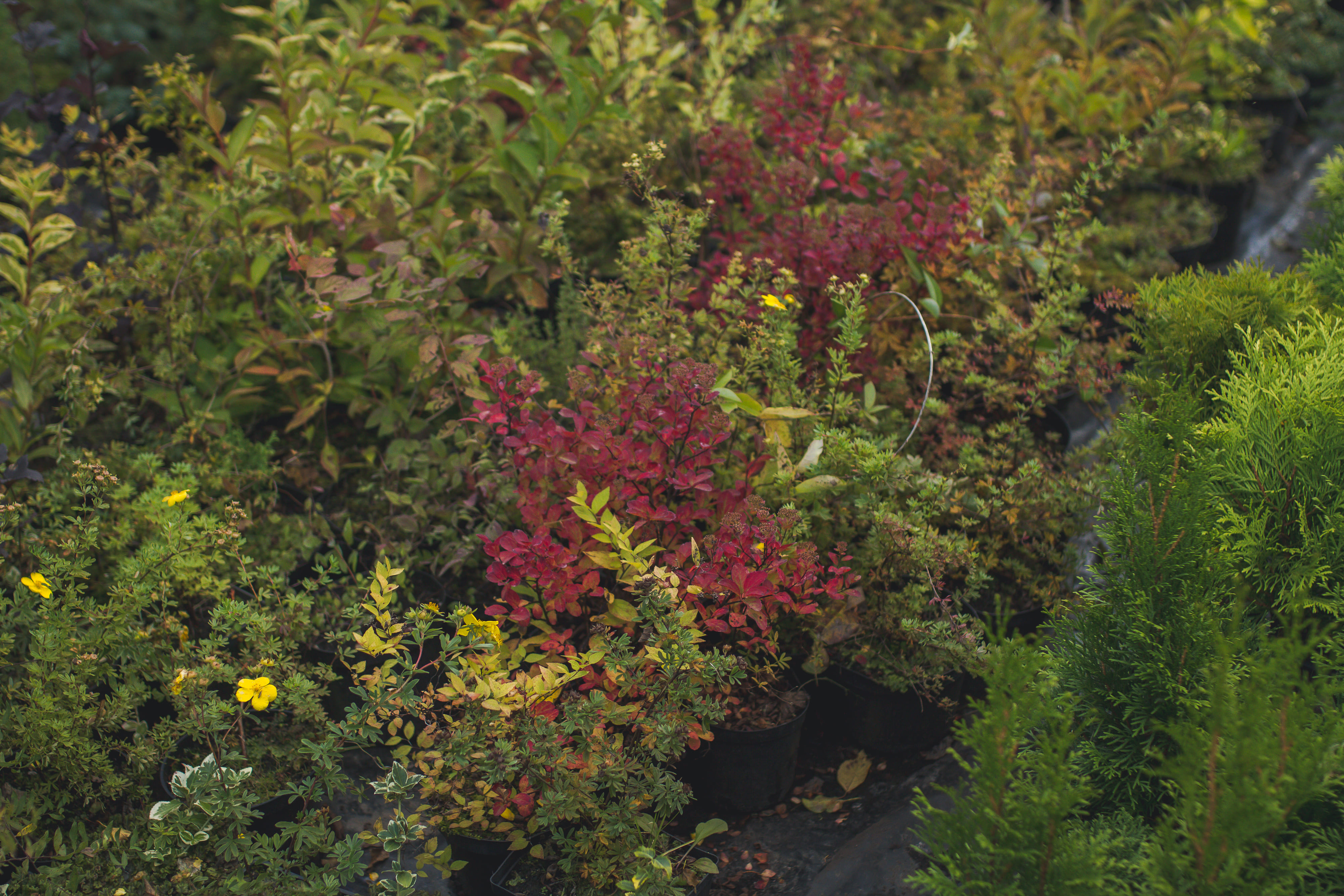 Лиственные: гортензии, самшит, вейгела, лапчатка, форзиция, пахисандра, ивы (4 вида), пузыреплодник, бересклет, плющ, спиреи.