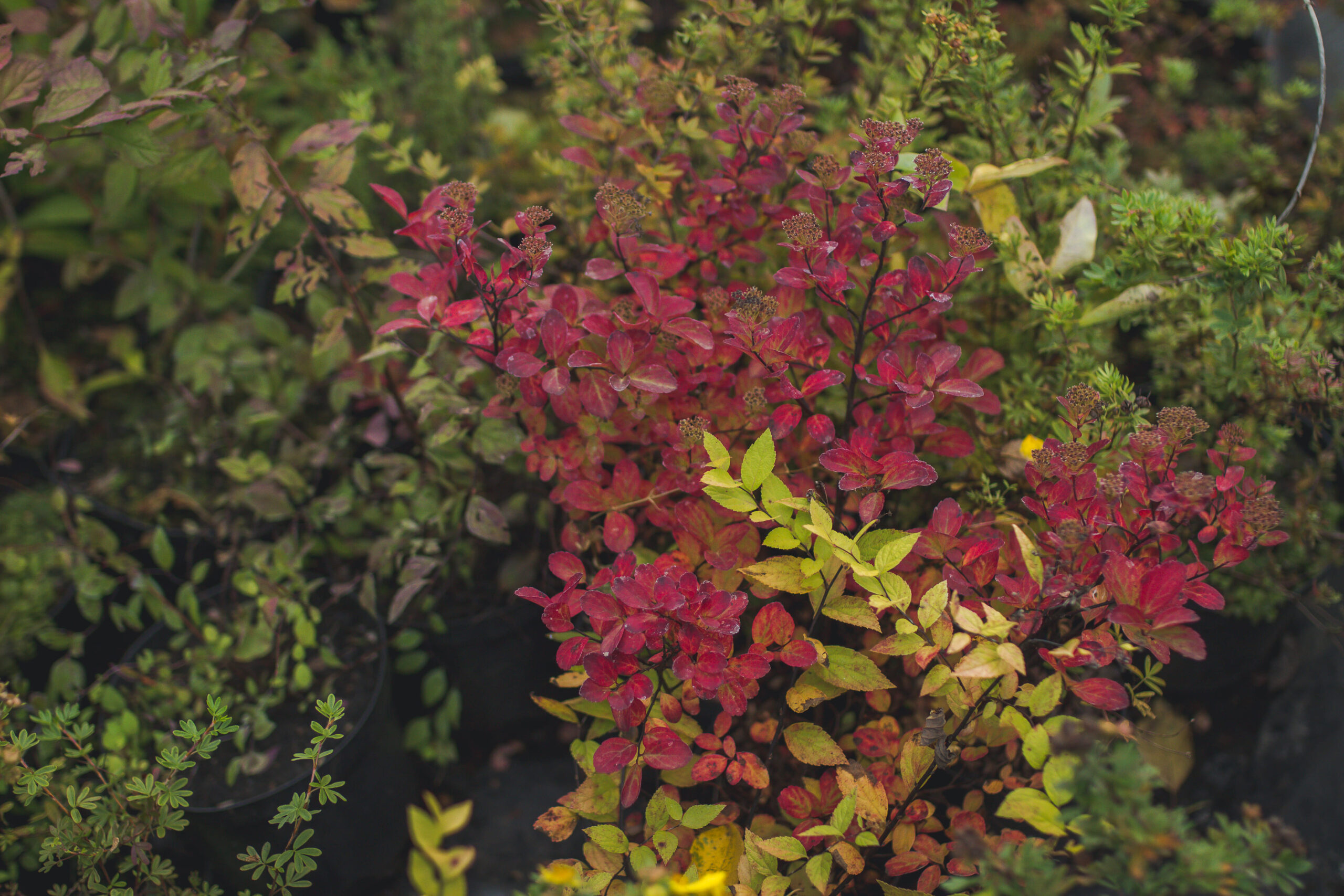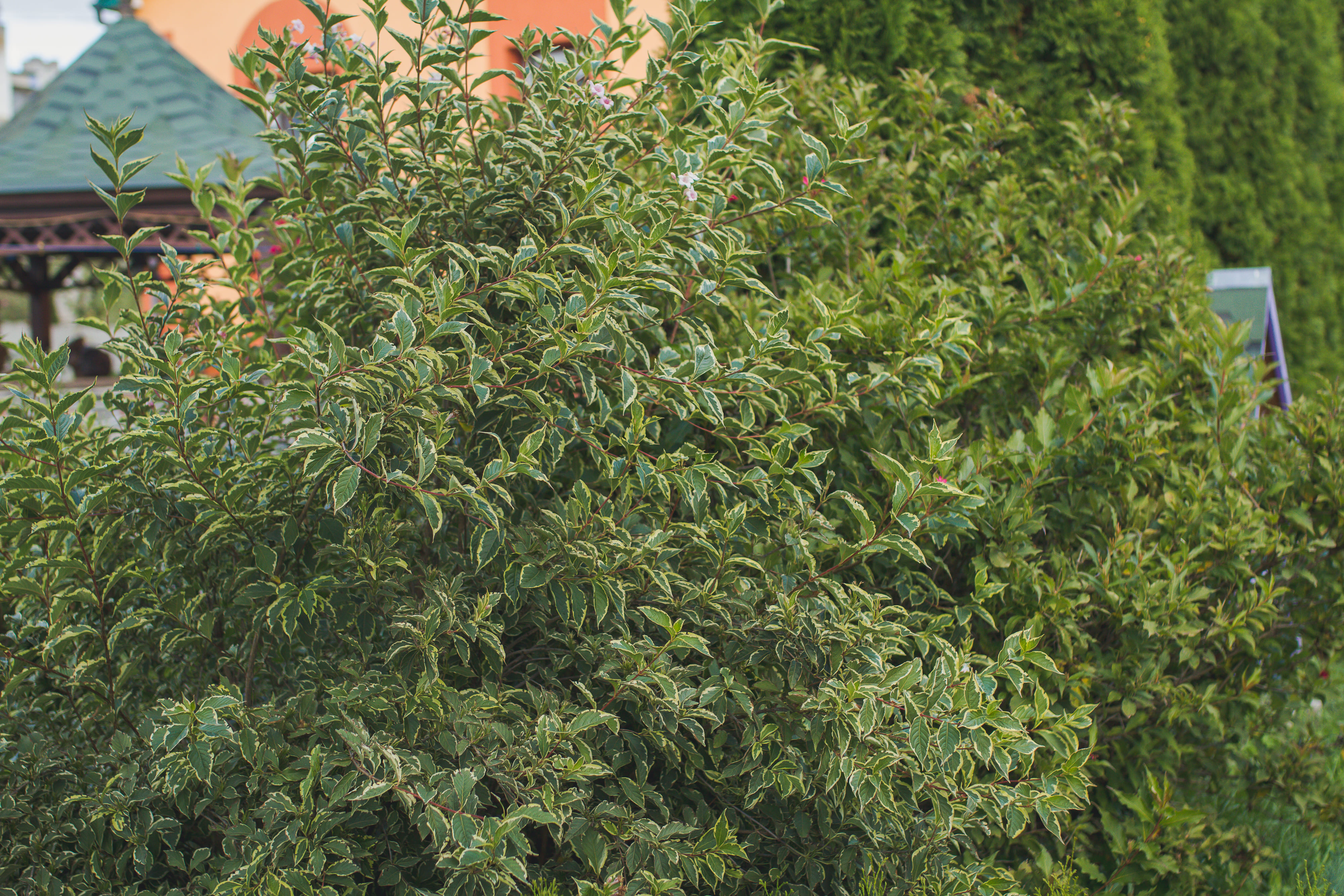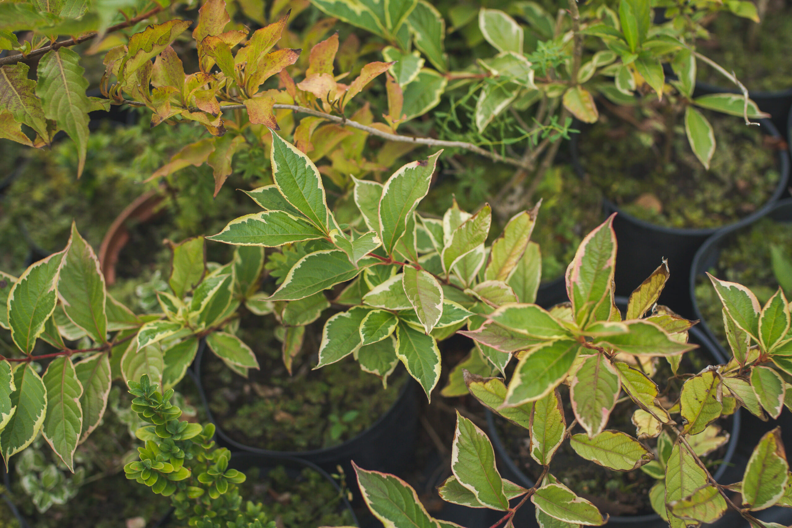 Лиственные: гортензии, самшит, вейгела, лапчатка, форзиция, пахисандра, ивы (4 вида), пузыреплодник, бересклет, плющ, спиреи.